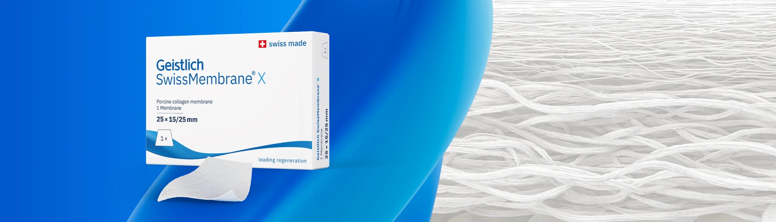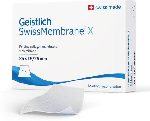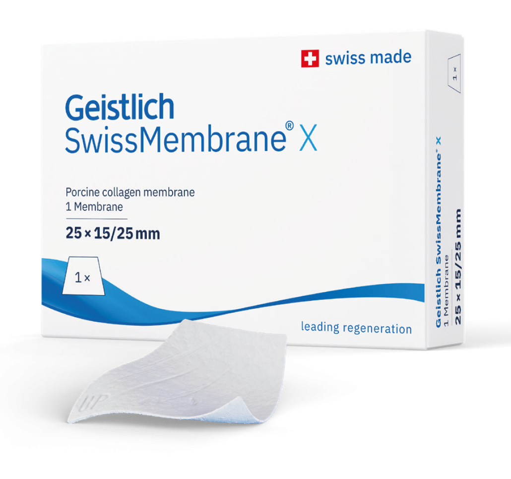 Geistlich SwissMembrane® X es una membrana de barrera reabsorbible destinada a la regeneración ósea guiada. Es una membrana de colágeno desarrollada para proteger injertos óseos con un grosor mínimo. Basada en la tecnología probada de Geistlich, proporciona un rendimiento práctico y fiabilidad clínica.